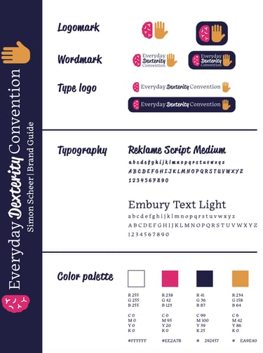 This project was created to show off the new, dynamic brand system for Everyday Dexterity Convention. Skill toys are one of Simon's strange passions, so when one of his classes asked him to create a fictional convention based on them, he immediately jumped on the challenge. Our class required us to created a logo for our brand, as you see below, as well as an animated version of the logo, which you can see in the video presentation below.